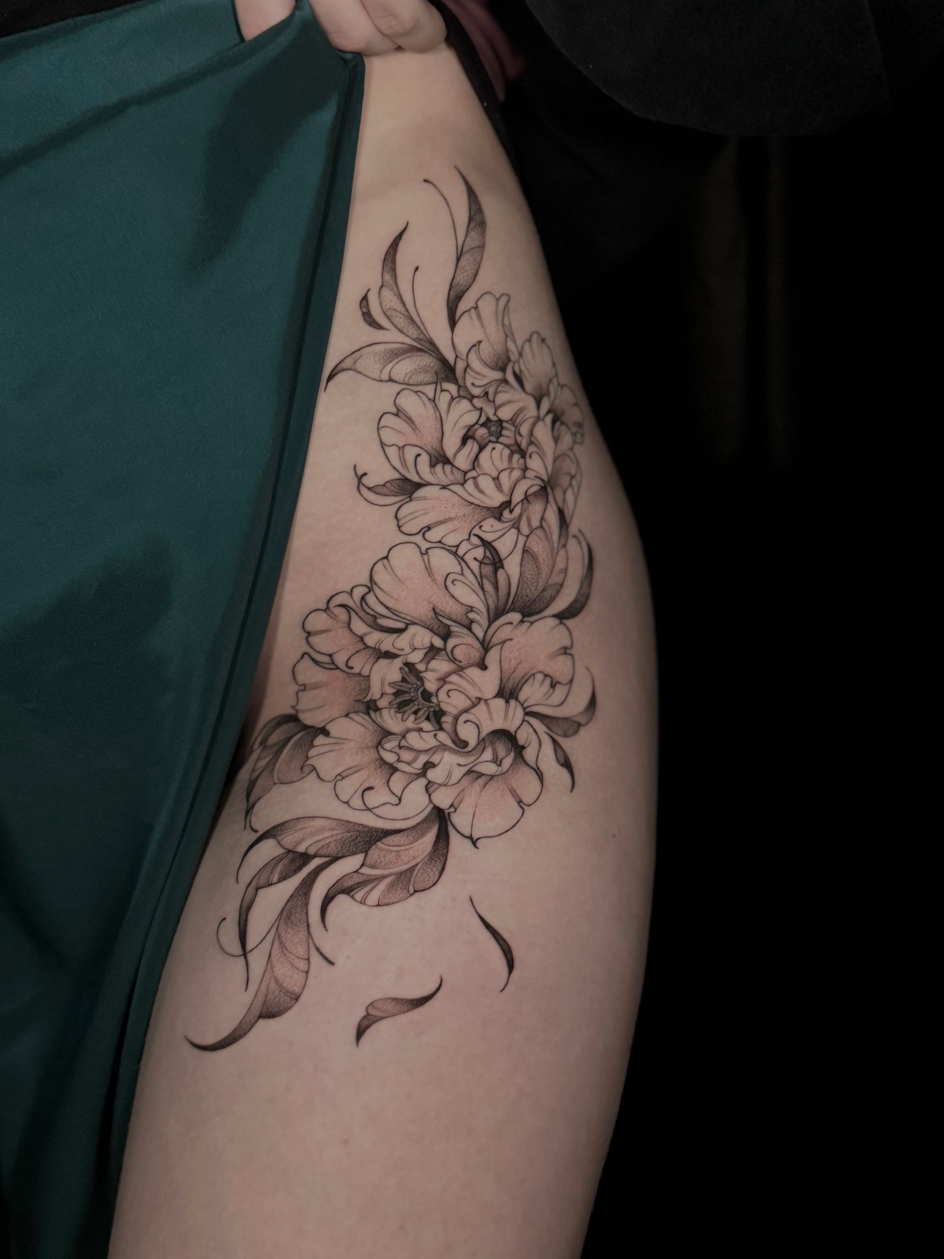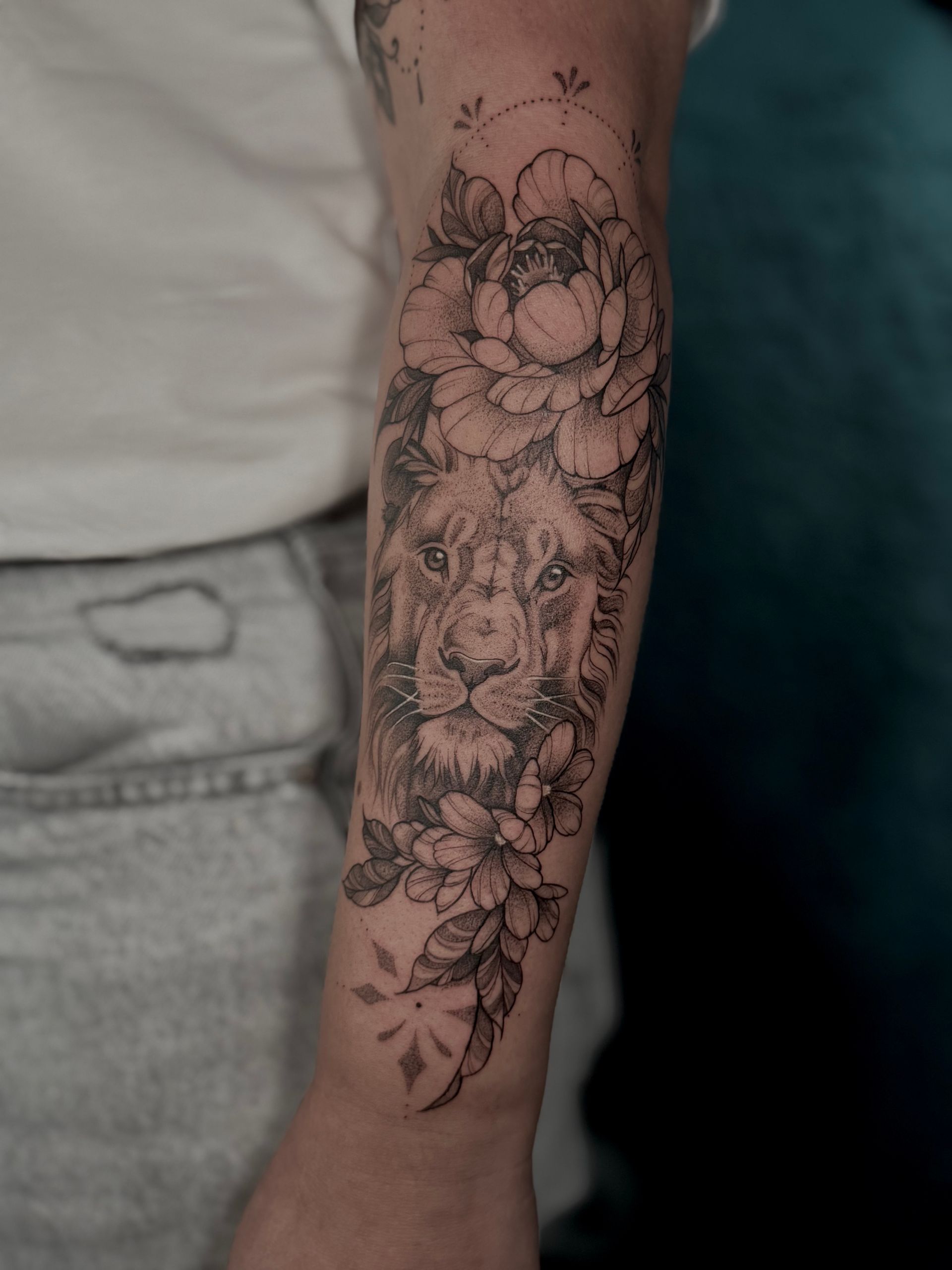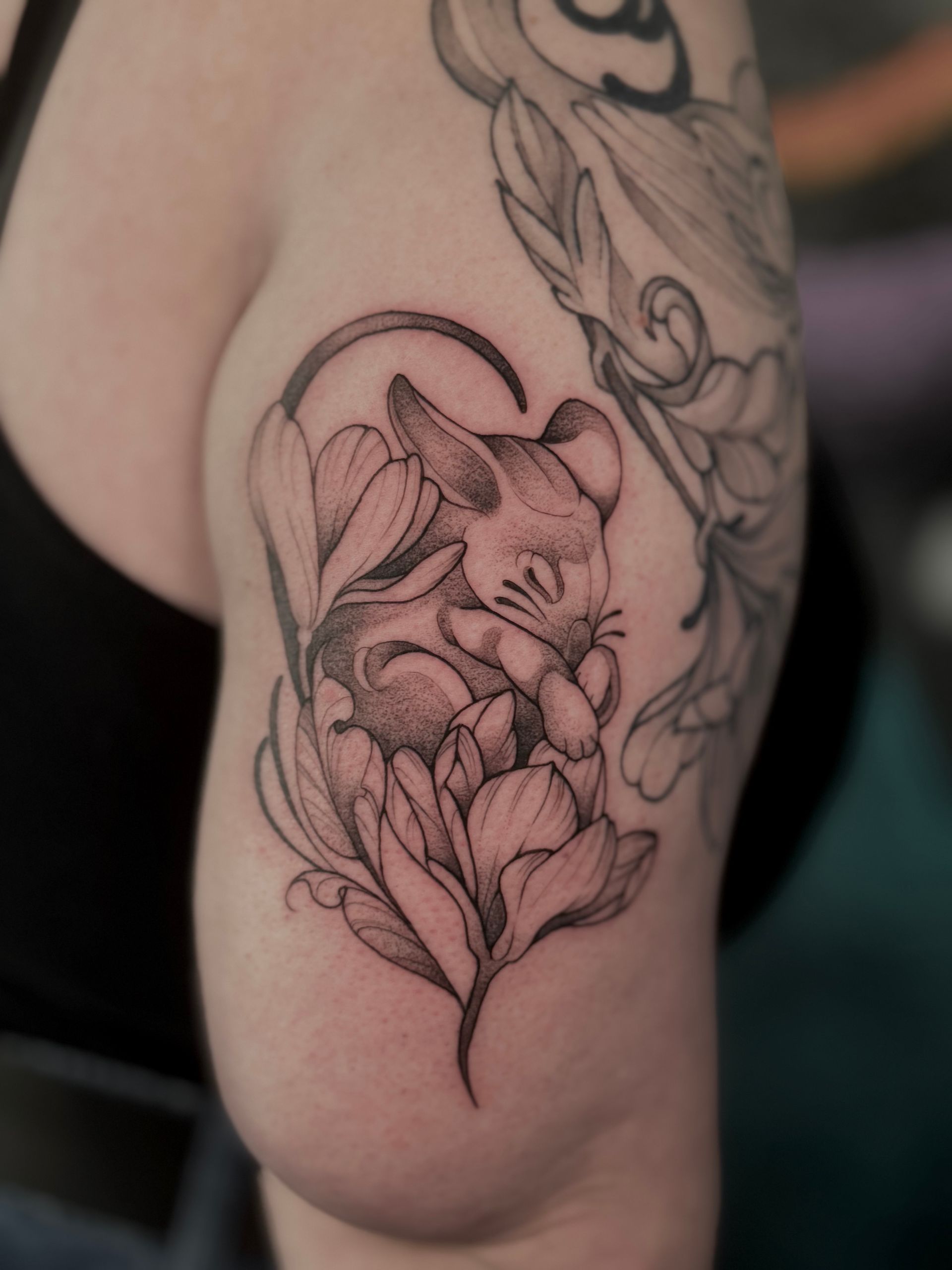 Sie tätowiert seit 2023 und schafft individuelle Tattoos mit floralen, Tier- und Frauenmotiven sowie Anime-Designs, alle liebevoll gezeichnet und detailreich.